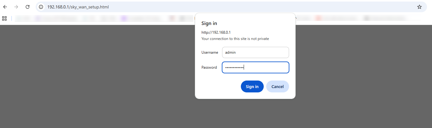 The username is "admin" and the password is your WiFi password. If you don't know your WiFi password, it is often found on a label on the back of the Sky Hub.