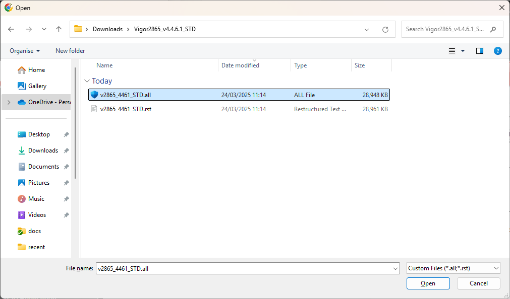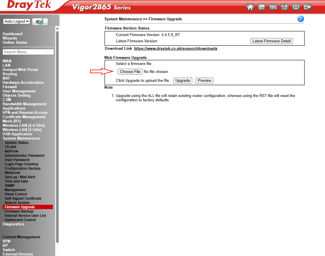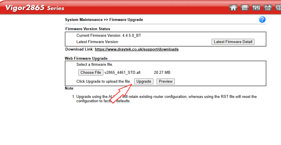 First you will need the firmware file. This can be downloaded from the Draytek website at https://www.draytek.co.uk/support/downloads or following a link we have sent you.
